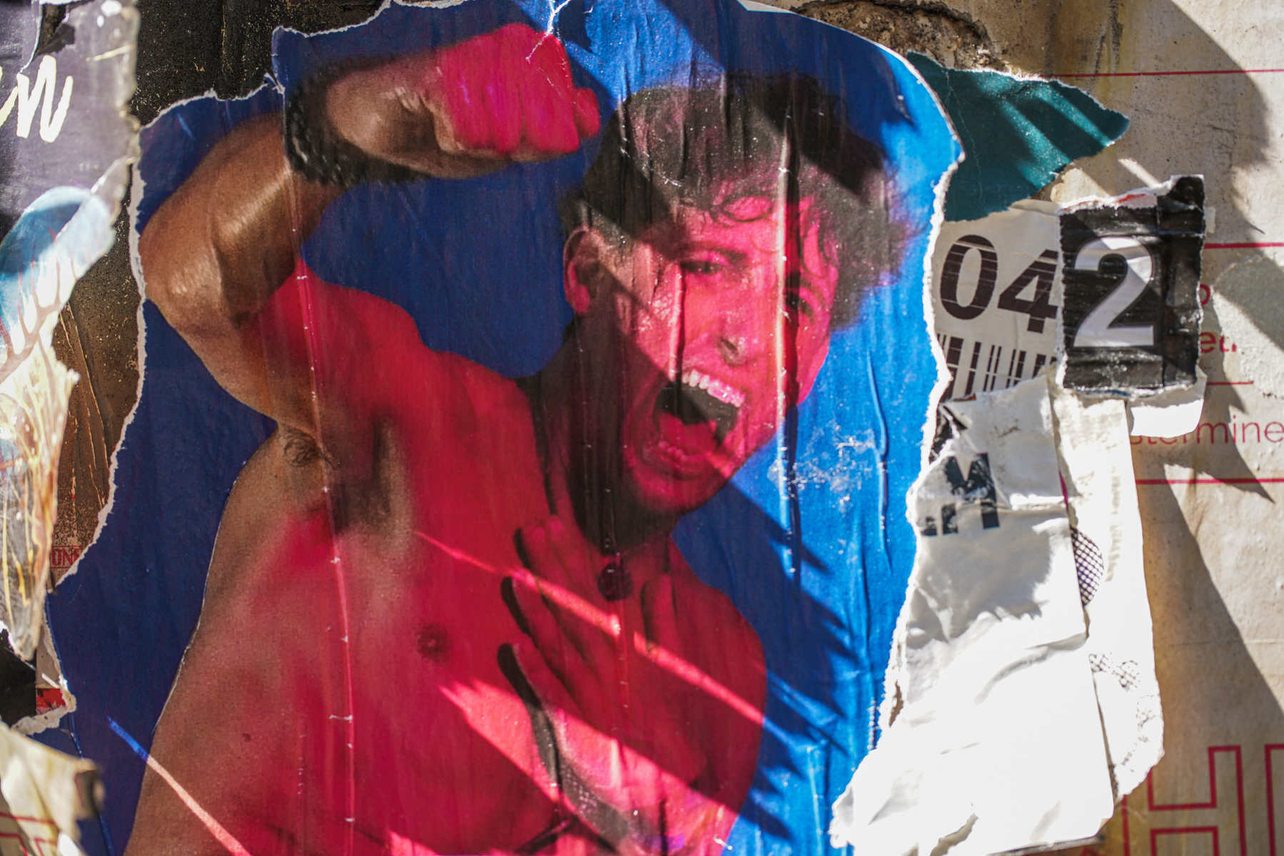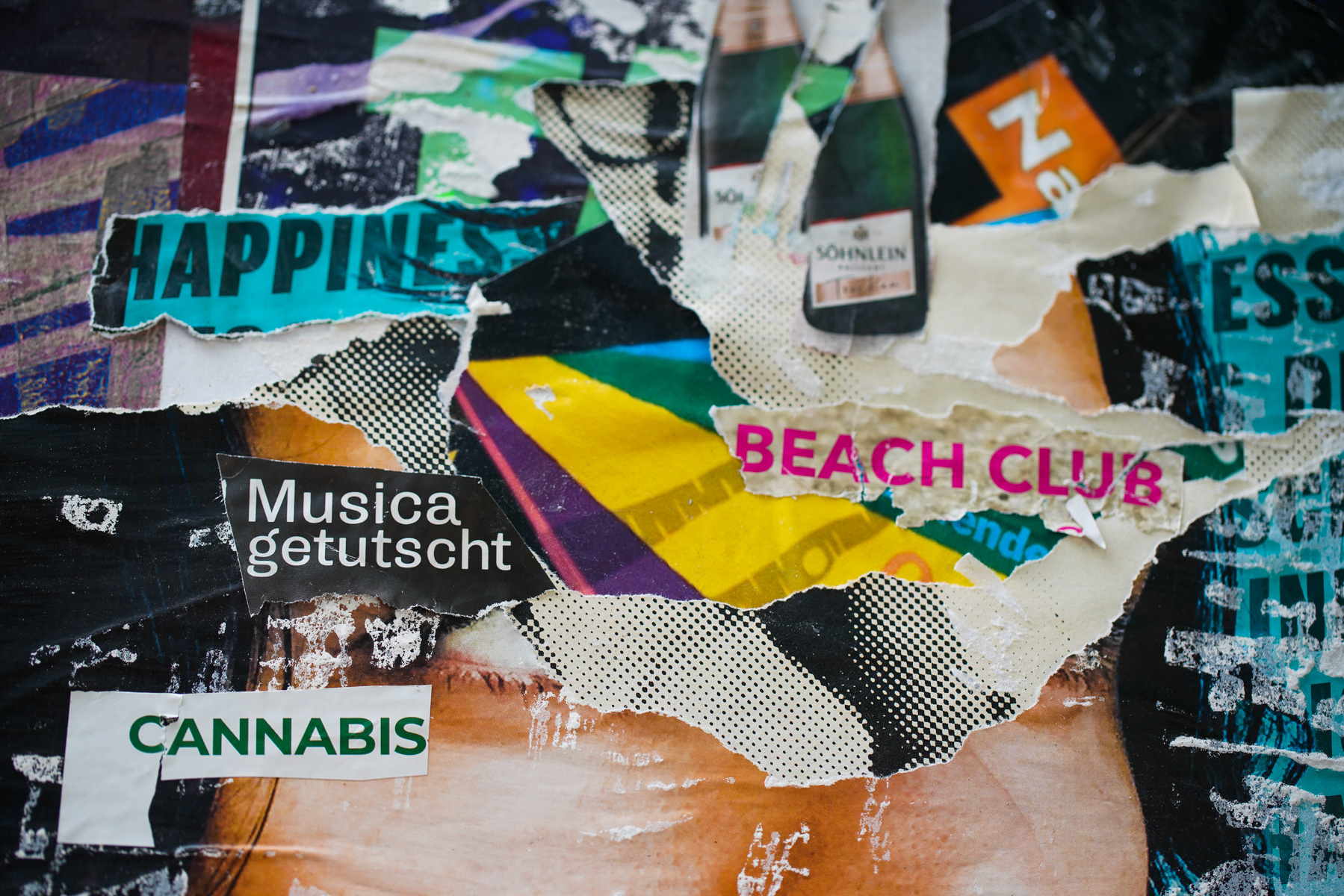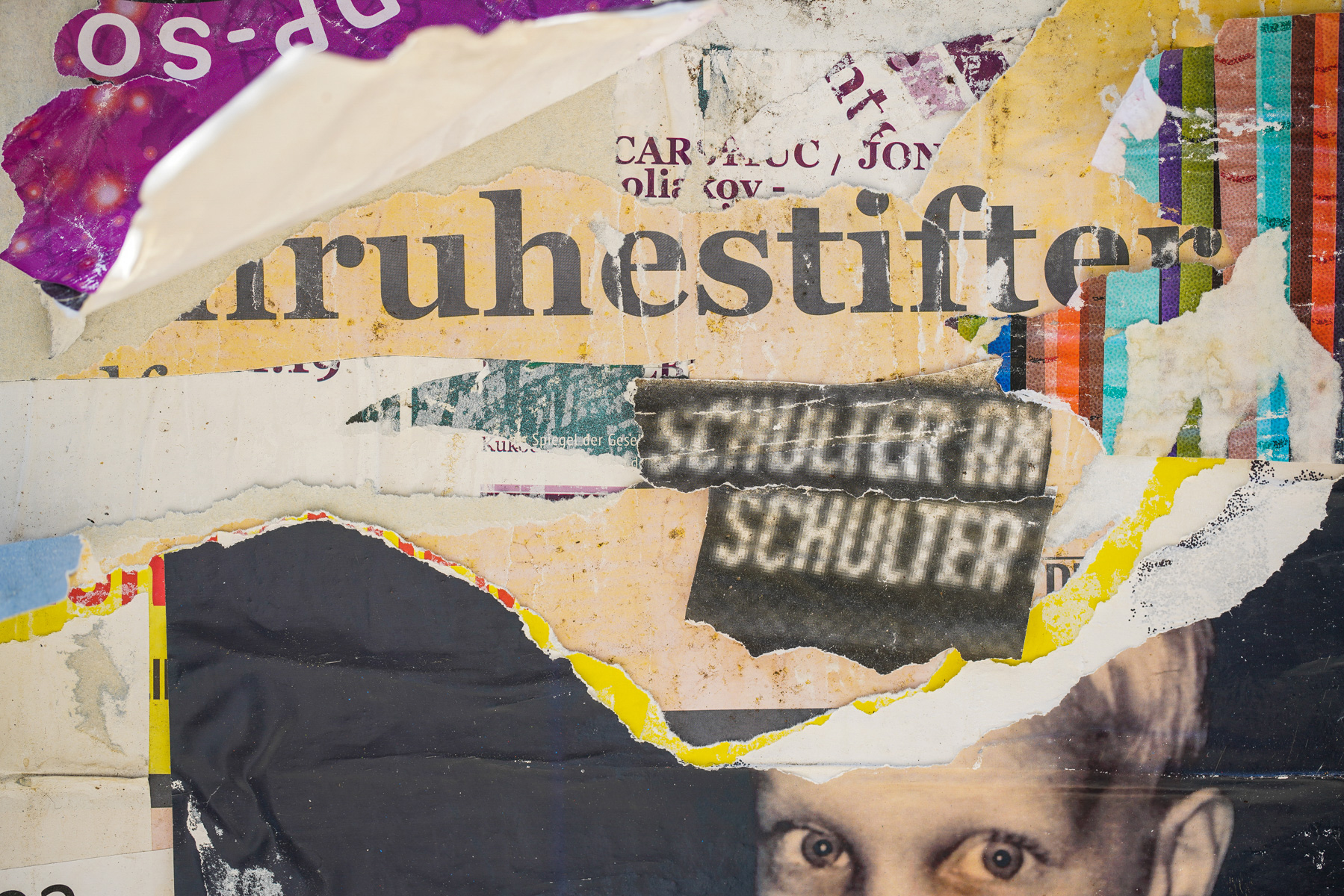 Für meine Serie entschied ich mich für die Erstellung von Collagen aus Plakaten, die ich im öffentlichen Raum entdeckte und den Themen entsprechend vor Ort arrangierte. Es waren keine ganzen Plakate, sondern Ausschnitte, Ausrisse und Fragmente. Die meisten Plakate – soweit es sich nicht um Produktwerbung handelt – werben für Musikveranstaltungen und Theateraufführungen. Sie schienen mir daher gut geeignet, eine Serie zum Oberthema Symphonie und den von der Musik inspirierten Einzelthemen zu erstellen.