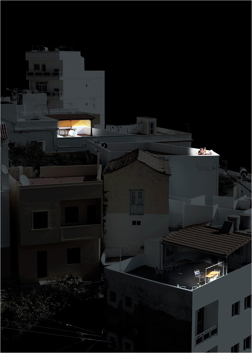 Drei Terrassen fungieren als Fragmente des Bewohnten – nur eine Insel ist mit einem Paar belebt – Fragment/ Pars pro toto für alle Bewohner:innen. Urlaubs-Atmosphäre macht sich breit. Bei Tageslicht ist sicher das nahe Meer zu sehen. Während auf zwei beleuchteten, von Menschen verlassenen Terrassen die Lichtquelle glaubwürdig unter den Dachaufbauten vermutet werden kann – schöpft das Lichtfragment auf der Terrasse mit dem Urlaubs-Paar seine Kraft aus einer imaginären Quelle. Drei behauste Terrassen, lebendige Fragmente in Licht getaucht, sind von schlafender Architektur umgeben.